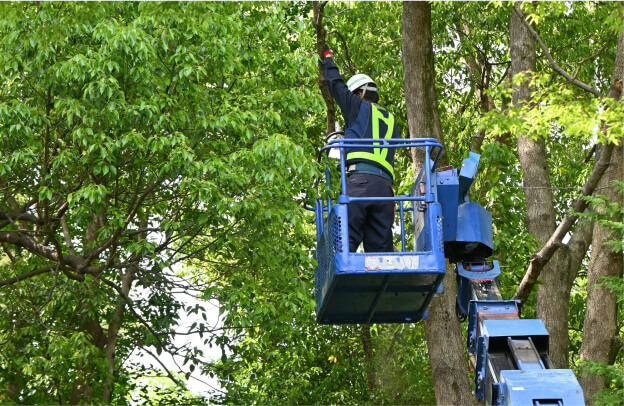 枝が電線に触れると、停電や火災の原因になります。電線付近での作業は極めて危険なため、専門的な特殊伐採による安全な処理が必要です。